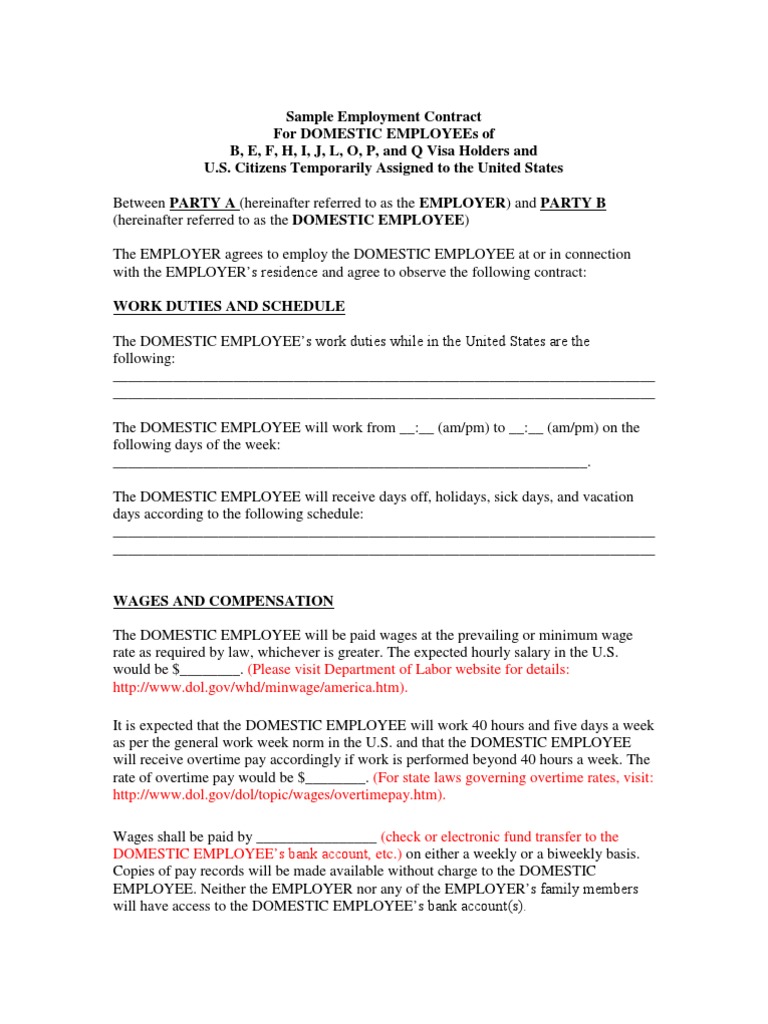 A description of the employee’s work. Sample domestic employee contract location of contract/date a. Guidelines for preparing employment contracts for domestic employees in the u.s. Domestic employee services agreement this agreement is concluded between _____, referred to as “employer” and _____, referred. Both the employer and the employee must sign a contract that includes the following at the minimum: