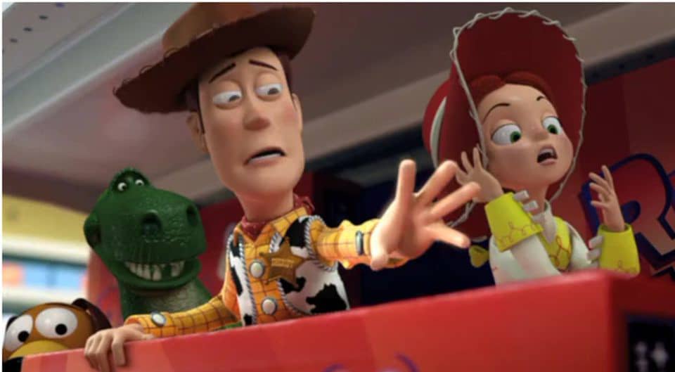 The gang from the toy story movies, are in a store, watching as a woman and her daughter are about to purchase buzz lightyear. Visa toy story 2010 commercial buzz gets bought.